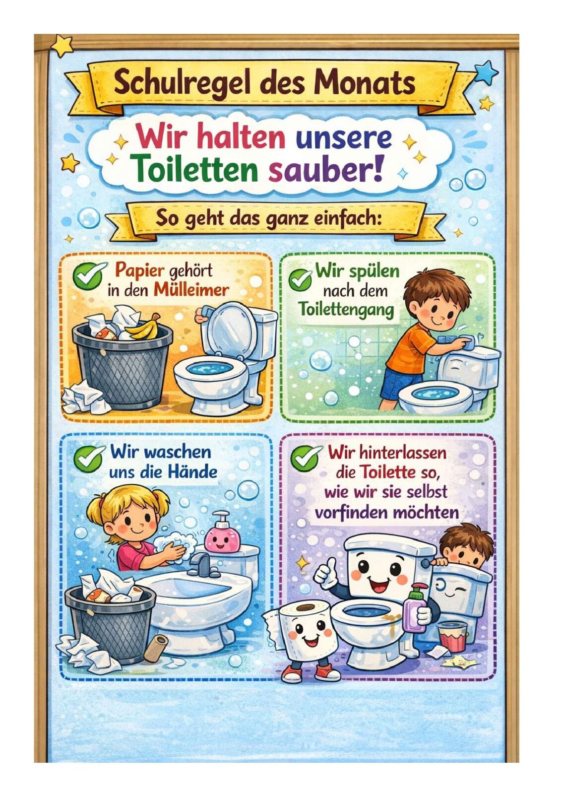 Gemeinsam mit den Kindern haben wir darüber gesprochen, warum Sauberkeit auf der Toilette wichtig ist – für uns selbst und für andere. Dabei ging es nicht nur um Hygiene, sondern auch um Rücksichtnahme und Verantwortung innerhalb der Gemeinschaft.